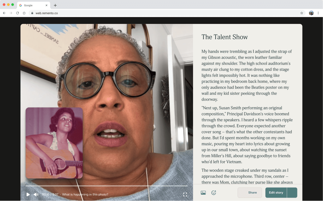 Then, Remento's Speech-to-Story technology turns those spoken memories into beautifully written narratives that retain the storyteller’s rhythm and tone. Families can choose between a polished narrative version or a lightly cleaned-up transcript that keeps their voice authentic.